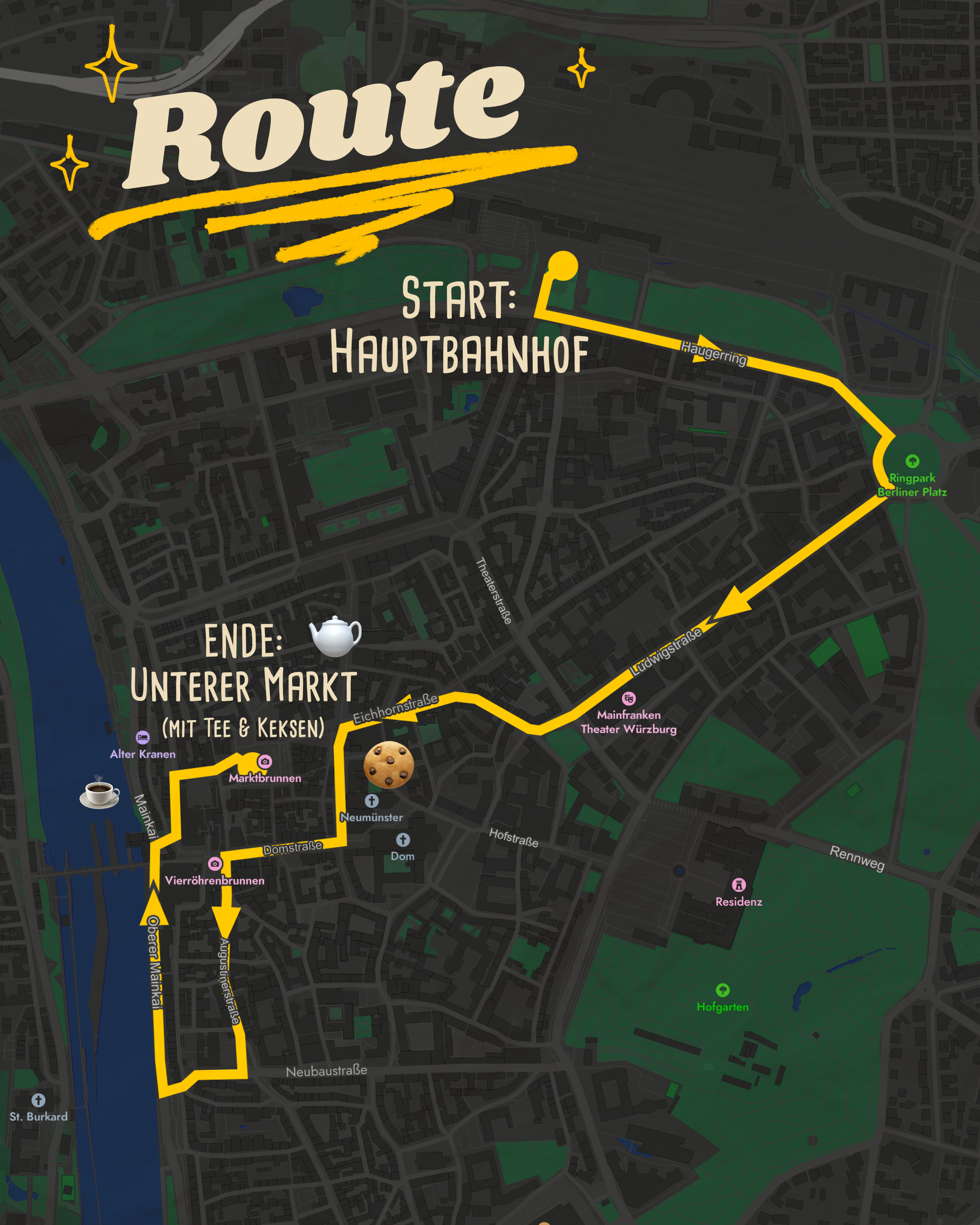 Los geht es um 16 Uhr am Hauptbahnhof. Die Route führt über Haugerring, Berliner Ring, Ludwigstraße, Spiegelstraße, Eichhornstraße, Schönbornstraße, Domstraße, Wirsberstraße, Oberer Mainkai, Karmelitenstraße und Rückermainstraße auf den Unteren Markt.