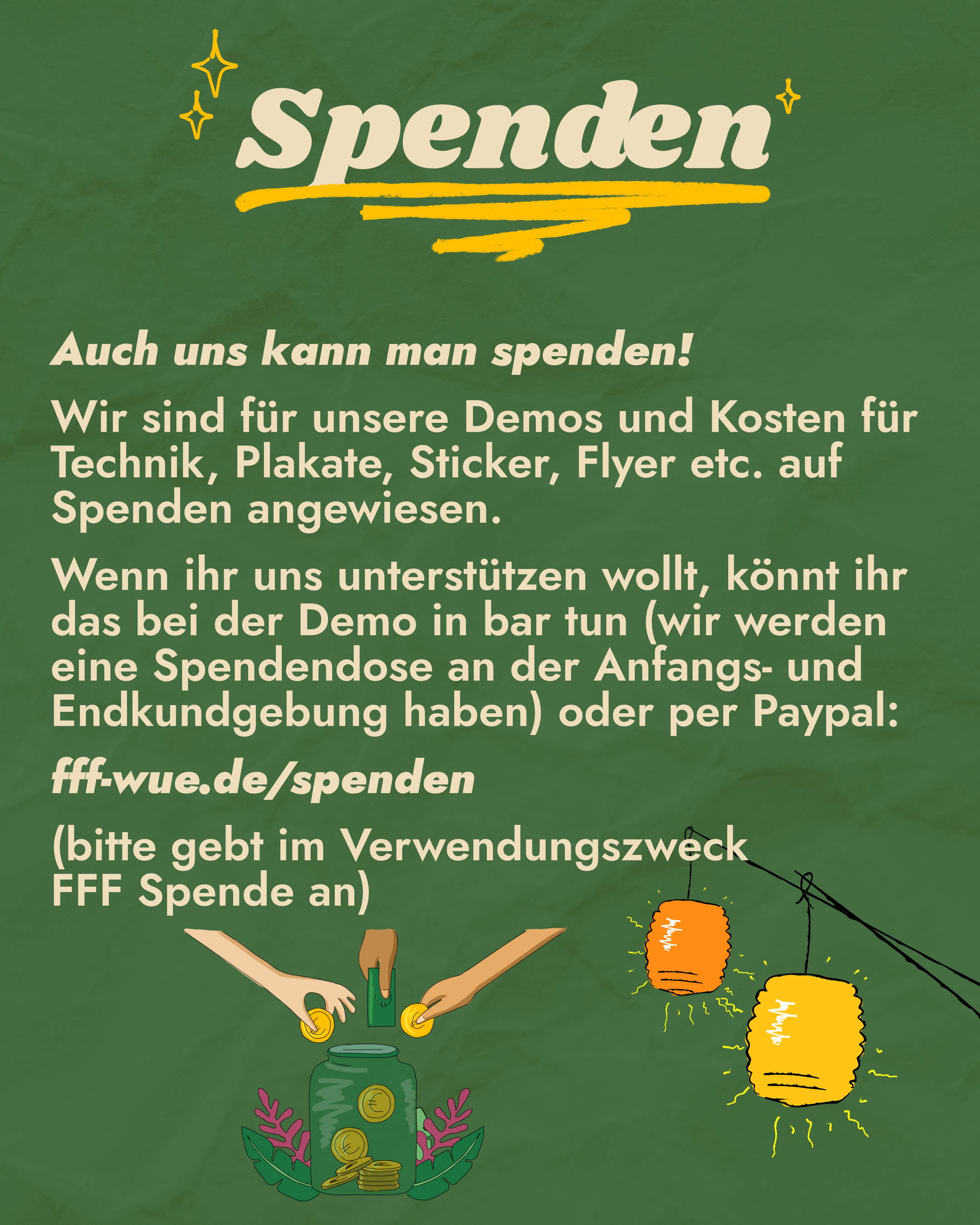 Das organisieren der Demos, Technik, Plakate, Flyer, etc. kosten viel Geld. Falls ihr davon etwas übrig habt, könnt ihr uns gerne auch finanziell unterstützen.
