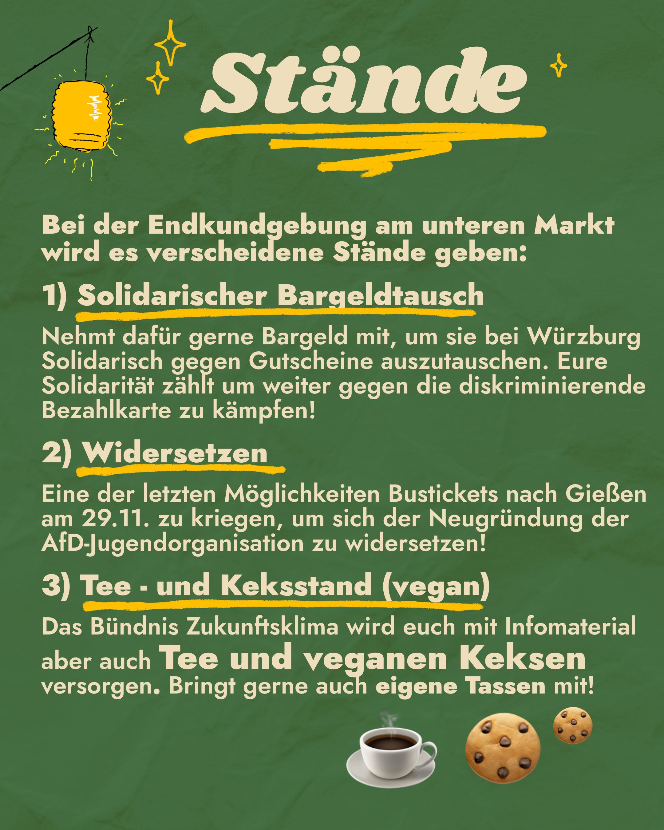 Am Unteren Markt findet unsere Abschlusskundgebung statt, außerdem gibt es dort (kostenlos / gegen Spende) Tee & vegane Kekse.