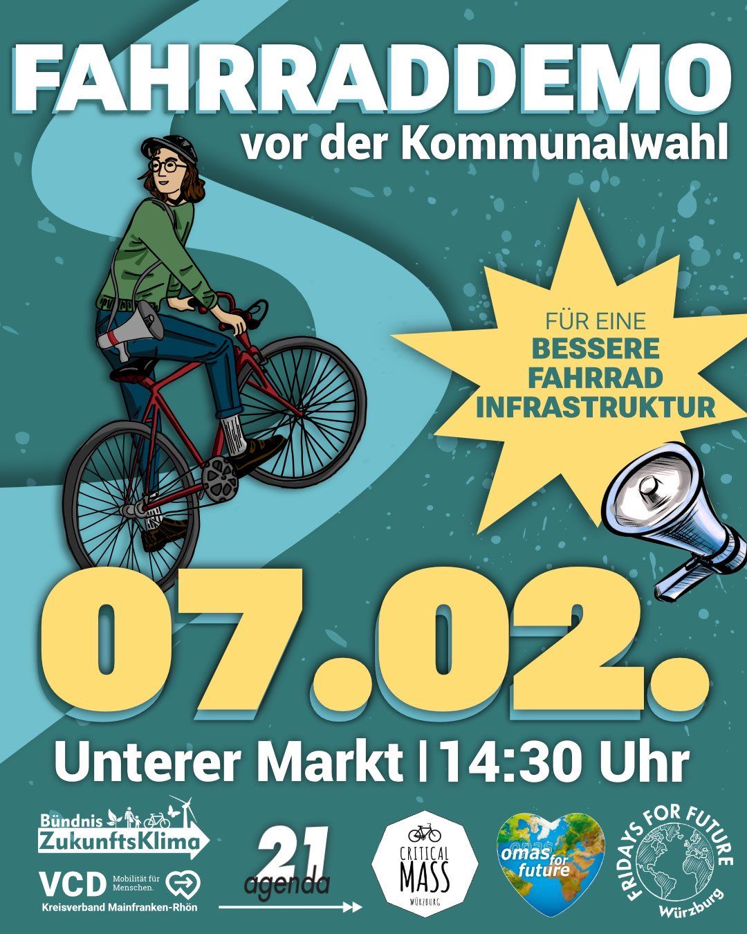 📢 Am 07.02. fahren wir gemeinsam durch Würzburg: Für bessere und sichere Fahrradinfrastruktur! Dabei steuern wir bewusst bekannte Gefahrenstellen wie die Löwenbrücke, den Berliner Ring und die Frankfurter Straße an.