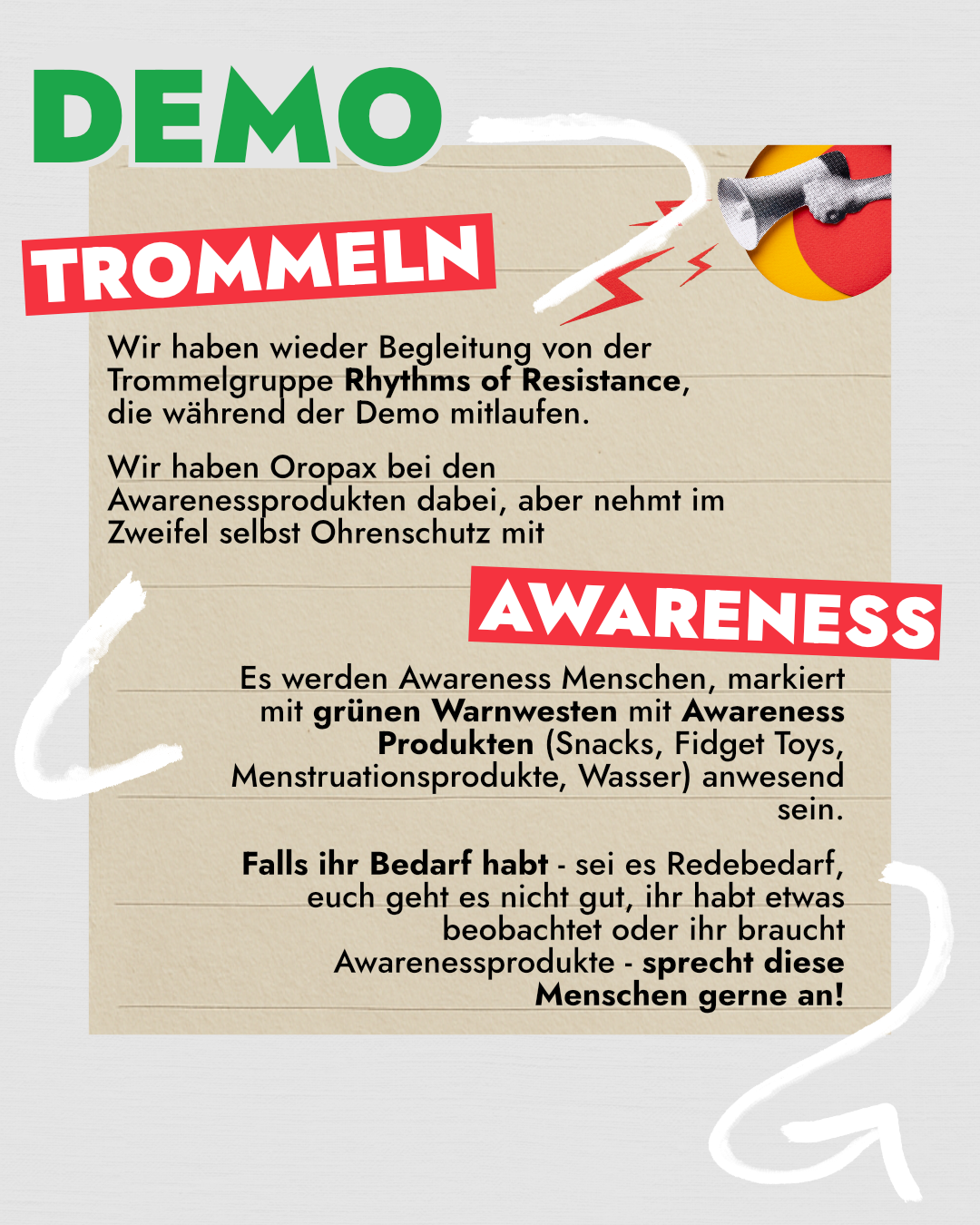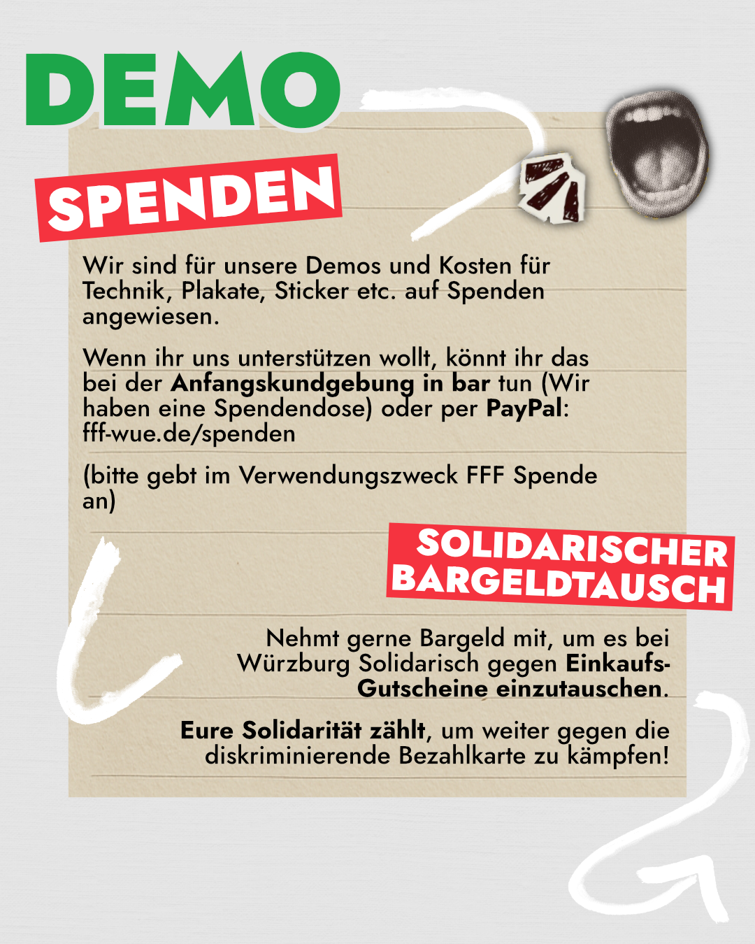 Das organisieren der Demos, Technik, Plakate, Flyer, etc. kosten viel Geld. Falls ihr davon etwas übrig habt, könnt ihr uns gerne auch finanziell unterstützen.