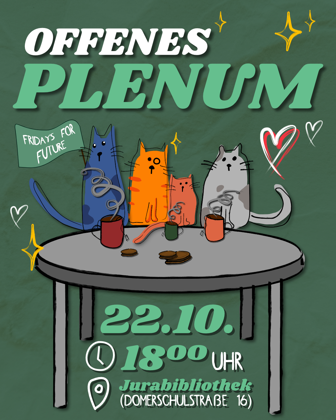 Du willst dich mehr für Klimagerechtigkeit einsetzen? Dann komm doch vorbei zu unserem offenen Plenum! 🌍💚 Wir geben dir einen Einblick in unsere Strukturen und in geplate Aktionen, bei denen du mitmachen kannst! ✨ 📆 22.10. 🕕 18 Uhr 📍 Eingang vor der Jurabibliothek (Domerschulstr. 16)